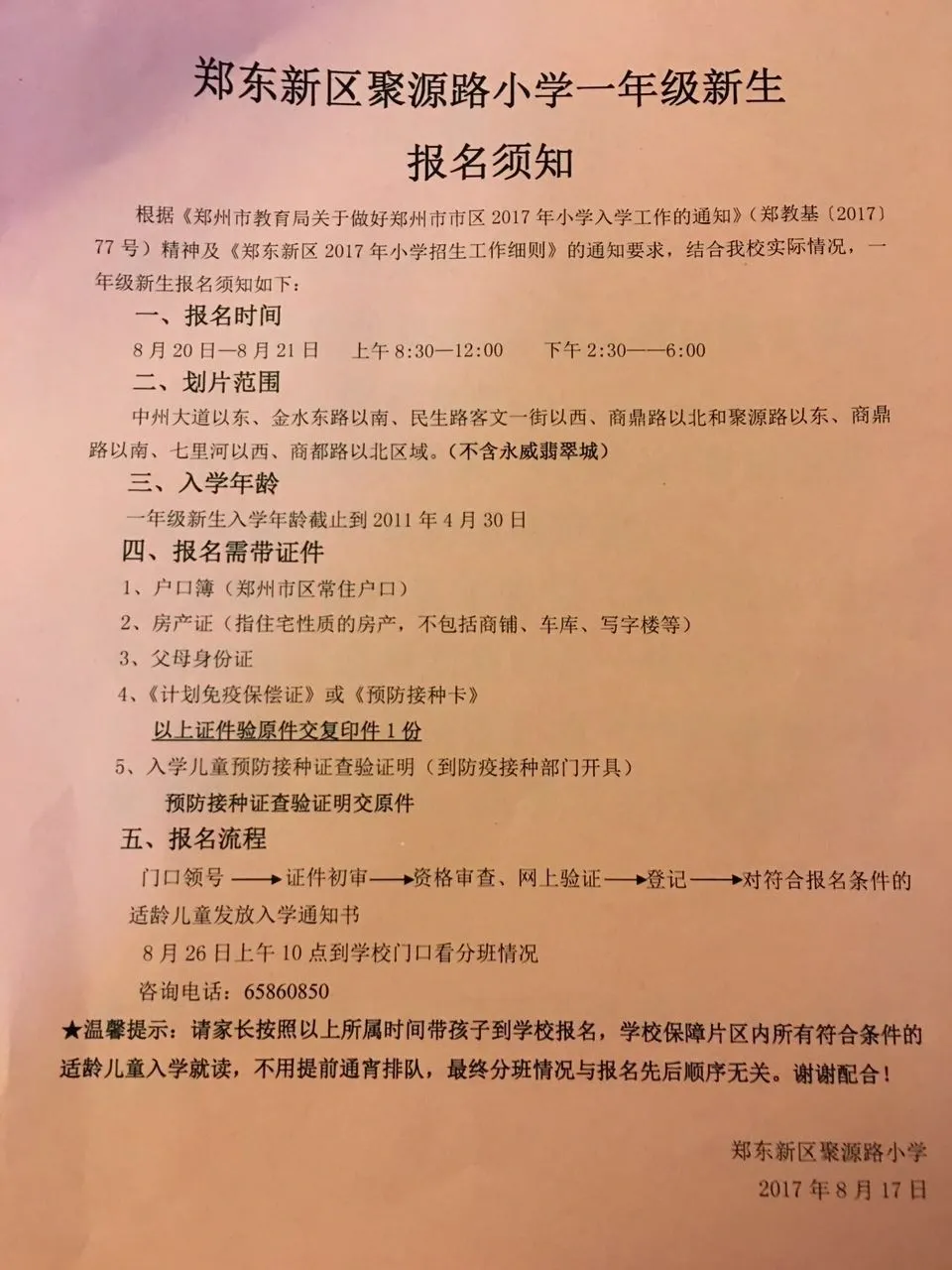 根据《郑州市教育局关于做好郑州市市区2017年小学入学工作的通知》(郑教基(2017)77号)精神及《郑东新区2017年小学招生工作细则》的通知要求,结合我校实际情况,一年级新生报名须知如下: