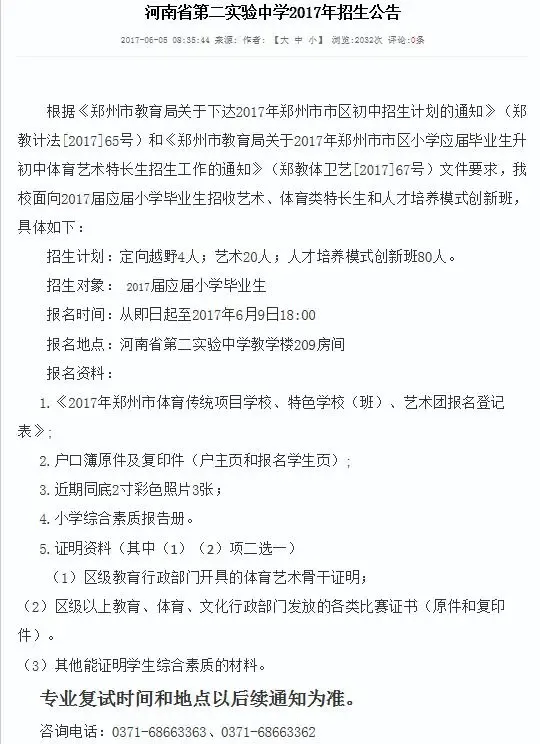 咨询电话:0371-68663363、0371-68663362根据《郑州市教育局关于下达2017年郑州市市区初中招生计划的通知》(郑教计法[2017]65号)和《郑州市教育局关于2017年郑州市市区小学应届毕业生升初中体育艺术特长生招生工作的通知》(郑教体卫艺[2017]67号)文件要求,我校面向2017届应届小学毕业生招收艺术、体育类特长生和人才培养模式创新班,具体如下: