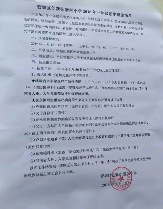管城区创新街紫荆小学2017年一年级新生招生简章